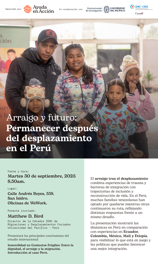 Matthew D. Bird, Director de la Cátedra IDRC de Migraciones y Desplazamientos Forzados de la Universidad del Pacífico, además del equipo de Ayuda en Acción Perú, que presentará su modelo de intervención en distritos del Cono Norte de Lima.