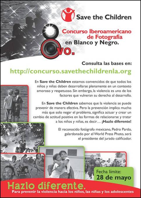 Hazlo diferente, da título al 8vo. Concurso Iberoamericano de Fotografía en Blanco y Negro, un espacio para que los participantes retraten el derecho y la oportunidad de cada niño y niña a vivir, una vida sin violencia, digna, plena y democrática.