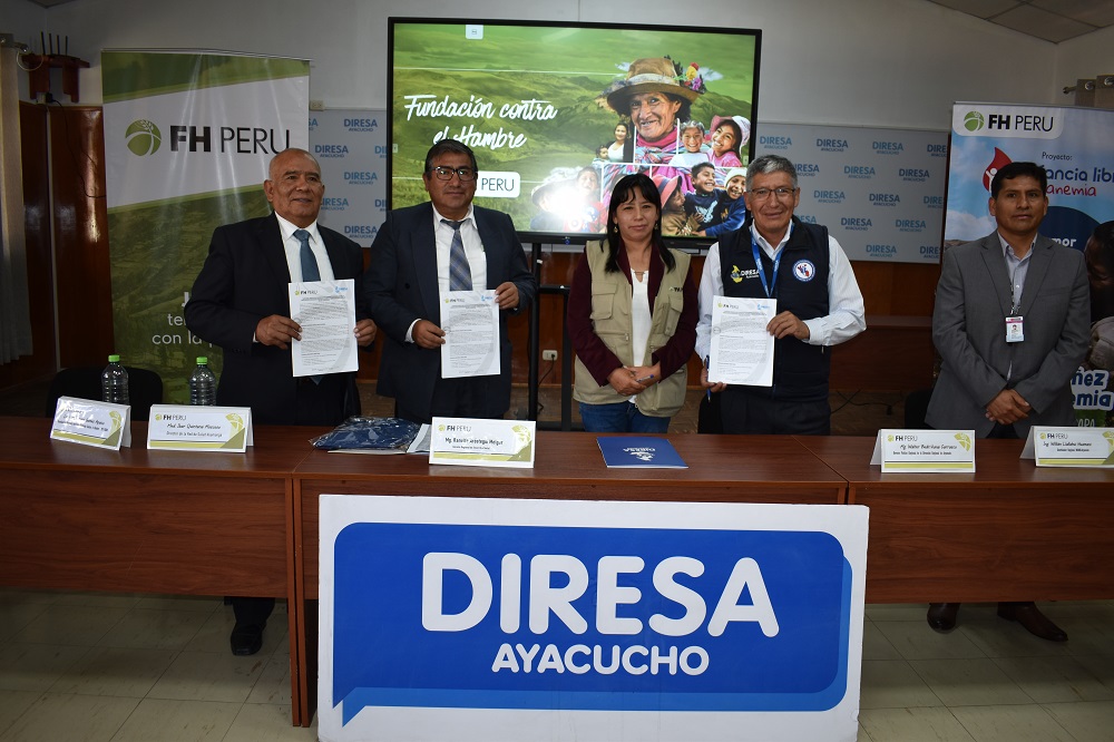 En el marco de lucha contra la anemia y la búsqueda de la reducción de sus niveles en el ámbito nacional, la Fundación contra el Hambre (FH Perú) viene estrechando alianzas con la Dirección Regional de Salud de Ayacucho (DIRESA), la Red de Salud Huamanga y 10 establecimientos de Salud de Vinchos y Socos, y el Hospital de Apoyo Jesús Nazareno a través de la suscripción de importantes Convenios Marcos de Cooperación Interinstitucional con el propósito de desarrollar un trabajo conjunto para alcanzar objetivos en común a favor de la niñez peruana.