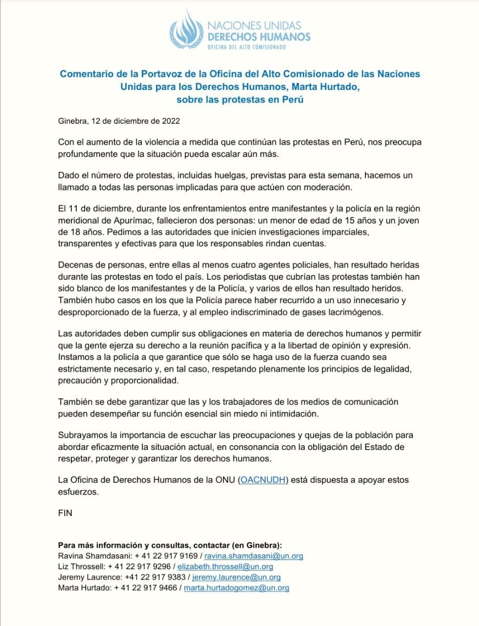 Comentario de la Portavoz de la Oficina del Alto Comisionado de las Naciones Unidas para los Derechos Humanos, Marta Hurtado, sobre las protestas en Perú