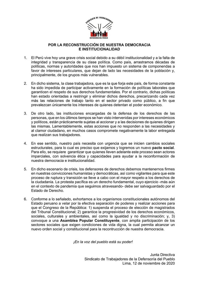 Comunicado del Sindicato de Trabajadores de la Defensoría del Pueblo