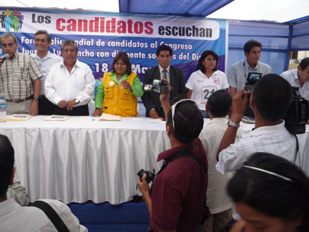 Al encuentro asistieron más de 300 mujeres de las organizaciones de base de San Juan de Lurigancho quienes escucharon atentamente las propuestas de las aspirantes al legislativo en torno a participación política de la mujer, salud y economía, violencia familiar y seguridad alimentaria con énfasis en la implementación de comedores populares. Las candidatas participantes fueron: Teresa Salazar Allain (Alianza por el Gran Cambio); Elizabeth Querol Campos y Pilar Freitas (Perú Posible); Bertha Tanta (Fonavistas del Perú), Rosa Mavila (Gana Perú); Elva Quiñones, Susel Paredes y Rosa Dueñas Morales (Fuerza Social).