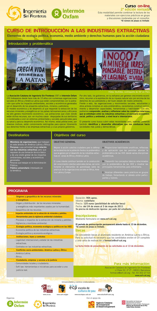 La Asociación Catalana de Ingeniería Sin Fronteras (ISF) e Intermón Oxfam (IO) trabajamos desde hace más de 10 años con numerosas organizaciones sociales en África y América Latina que están comprometidas con la población que sufre los impactos ambientales, sociales y económicos generados por el desarrollo de los proyectos extractivos, mineros y petroleros.