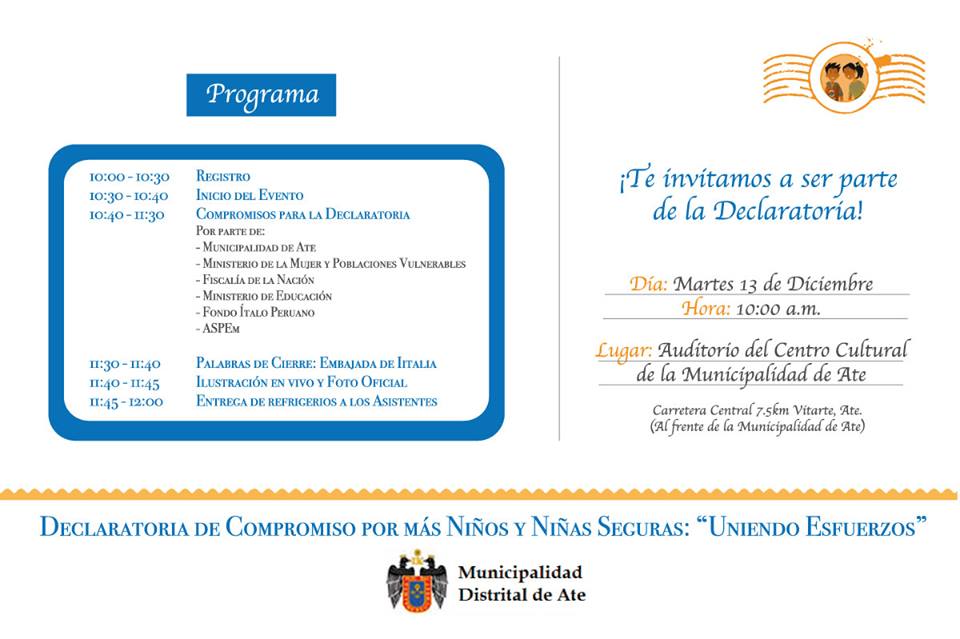 Te invitamos a ser parte de la Declaratoria de Compromiso por más Niños y Niñas Seguras. Éste será un evento en donde compartiremos las buenas prácticas y logros en el marco del cierre del Proyecto Lima Este Segura: Estrategia efectiva para la protección frente a la violencia y abuso sexual a niñas y niños gracias al financiamiento del Fondo Ítalo Peruano y también de los enfoques a continuidad por parte de la Municipalidad Distrital de Ate y entidades públicas y privadas comprometidos con el tema.