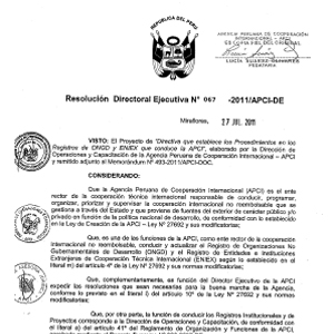 A través de la Resolución Directoral Ejecutiva Nrro. 067-2011/APCI-DE de fecha 27 de julio de 2011 la APCI aprobó la "Directiva que establece los Procedimientos en los Registros de ONGD y ENIEX". En la cual se establece procedimiento para la inscripción y renovación de la vigencia en los registros de ONGD y ENIEX; asimismo se establecen los procedimietnos para el cambio de denominación social y baja en los registros de ONGD y ENIEX.