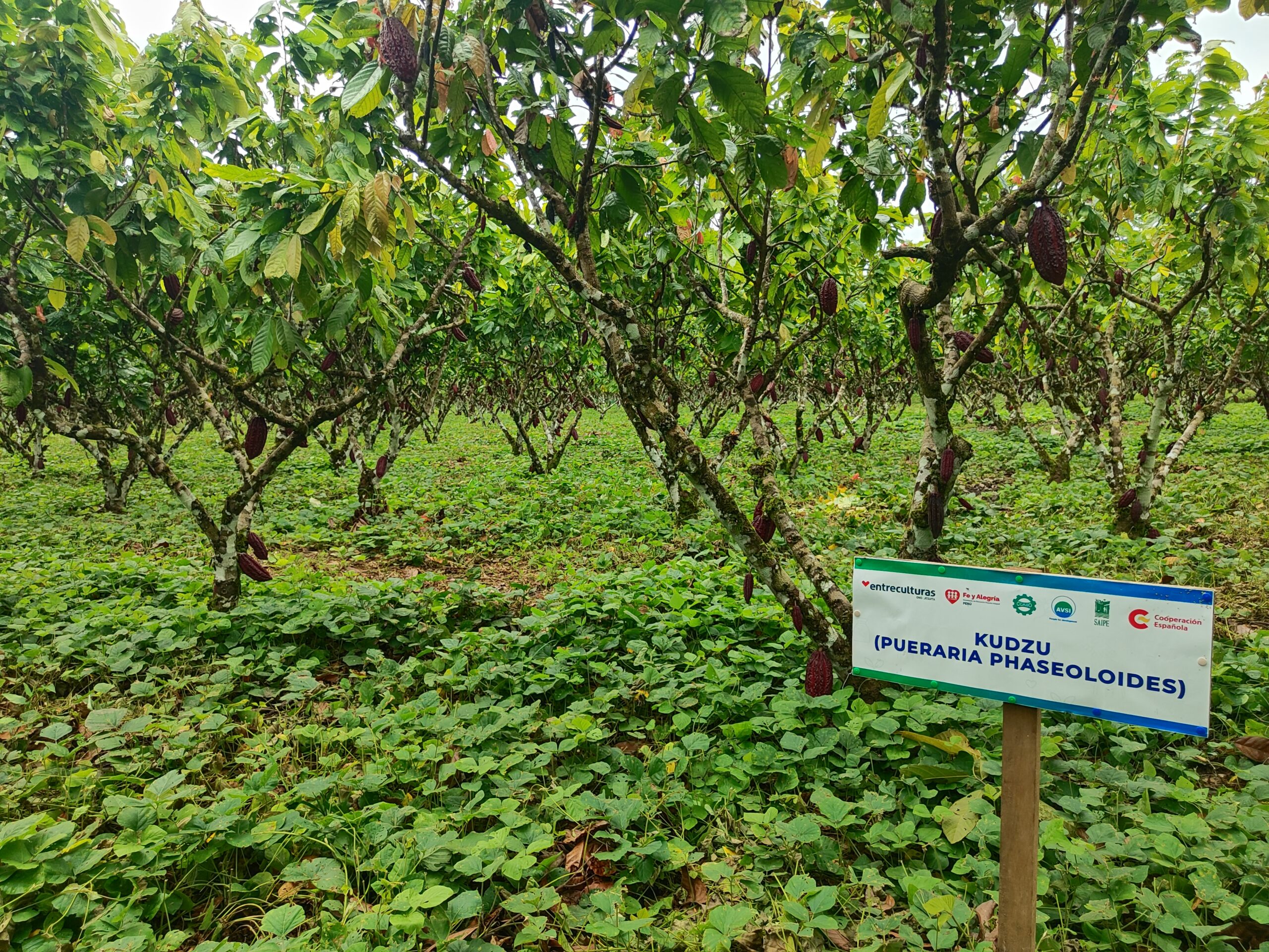 La cobertura de suelo con leguminosas rastreras consiste en proteger la superficie del terreno mediante especies vegetales de crecimiento horizontal que cubren el suelo de forma permanente. En Condorcanqui, la leguminosa kudzu (Pueraria phaseoloides) ha demostrado ser la especie que mejor se adapta a las condiciones climáticas y de suelo de la zona, aportando beneficios agronómicos y ambientales determinantes para el desempeño del cacao en contextos amazónicos. Su uso contribuye a conservar la humedad, reducir la erosión, suprimir malezas, mejorar la estructura del suelo y favorecer la actividad biológica; factores esenciales para la productividad, la estabilidad del cultivo y el manejo sostenible de las parcelas.