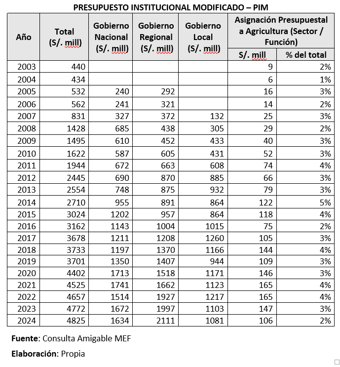 El crecimiento económico del Perú y el proceso de descentralización en los últimos 20 años, ha posibilitado que el presupuesto asignado al departamento de Huánuco (de los 03 niveles de gobierno), pase de 532 millones de soles a casi 5 mil millones de soles (incrementó en 800%), donde, aproximadamente el 60% es manejado por el gobierno regional y los gobiernos locales, es decir, con una gran oportunidad de solución a los problemas más sentidas por la población, con intervenciones directas principalmente en las comunidades rurales, donde la actividad agropecuaria es clave. Sin embargo, la proporción del presupuesto total, asignada para la agricultura, oscilo entre el 1 y 5%, lo cual evidencia la poca importancia y valoración de esta actividad por las autoridades regionales y locales de las gestiones que pasaron, tal como se muestra en el siguiente cuadro: