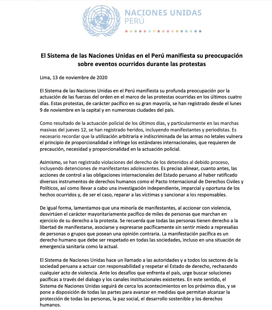 El Sistema de las Naciones Unidas en el Perú manifiesta su preocupación sobre eventos ocurridos durante las protestas