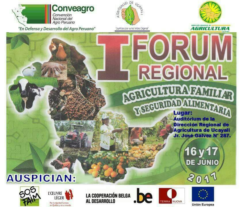 SOS FAIM estuvo presente en I Forum Regional de Agricultura Familiar y Seguridad Alimentaria que se realizó el 16 y 17 de junio, organizado por Conveagro, la Dirección Regional de Agricultura de Ucayali y la ONG AGROSALUD, con el apoyo de la Fundación Léger (Canadá), Terra Nuova (Italia) y SOS FAIM (Bélgica).El objetivo principal fue informar y comprometer a líderes agrarios, instituciones de la sociedad civil, funcionarios y autoridades del Estado para la implementación de la Ley de Promoción y Desarrollo de la Agricultura Familiar (Ley 30355) y su respectivo Reglamento.