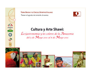 Bajo el nombre de “Cultura y arte Shawi: La Gastronomía y los Colores de la Amazonía” se realizarán del 5 al 8 de mayo en la sede del Circolo Sportivo Italiano (Av. Juan Pablo Fernandini 1530, Pueblo Libre) jornadas culturales en las que se podrá apreciar fotografías, cerámicas y pinturas del pueblo Shawi.