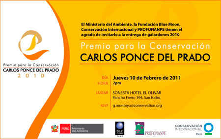 El Ministerio del Ambiente, la Fundación Blue Moon, Conservación Internacional y PROFONANPE tienen el agrado de invitarlos a la ceremonia de entrega de galardones del “Premio para la Conservación Carlos Ponce del Prado 2010” que se realizará el día jueves 10 de Febrero a las 7:00pm, en el SONESTA HOTEL EL OLIVAR, Pancho Fierro 194, San Isidro.