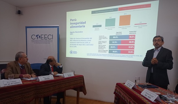La primera intervención estuvo a cargo de Jorge Moreno (MIDAGRI), quien expresó su preocupación por la situación del hambre y los efectos de la pandemia. Destacó la importancia del sector agrario en la economía peruana (24% de los empleos) por ende la agricultura familiar de subsistencia, la incidencia del Covid, la escasez de fertilizantes y el incremento de los precios internacionales de los productos agrícolas. Manifestó su preocupación por la inseguridad alimentaria, y la soberanía alimentaria y nutricional.