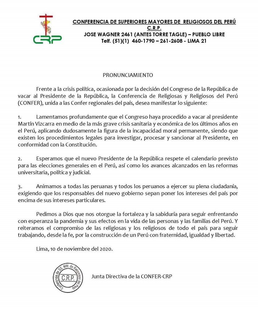 Pronunciamiento de la Conferencia de Superiores Mayores de Religiosos del Perú
