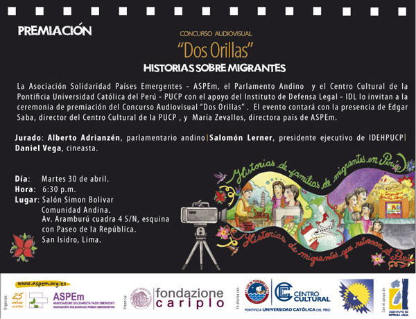 La Asociación Solidaridad Países Emergentes (ASPEM), el Parlamento Andino y el Centro Cultural de la PUCP - con el apoyo del IDL – llevarán a cabo la premiación pública, el martes 30 de abril, del concurso audiovisual “Dos Orillas”, que busca sensibilizar a la sociedad peruana frente a la dura problemática que atraviesan nuestros 3 millones y medio de connacionales en el exterior.