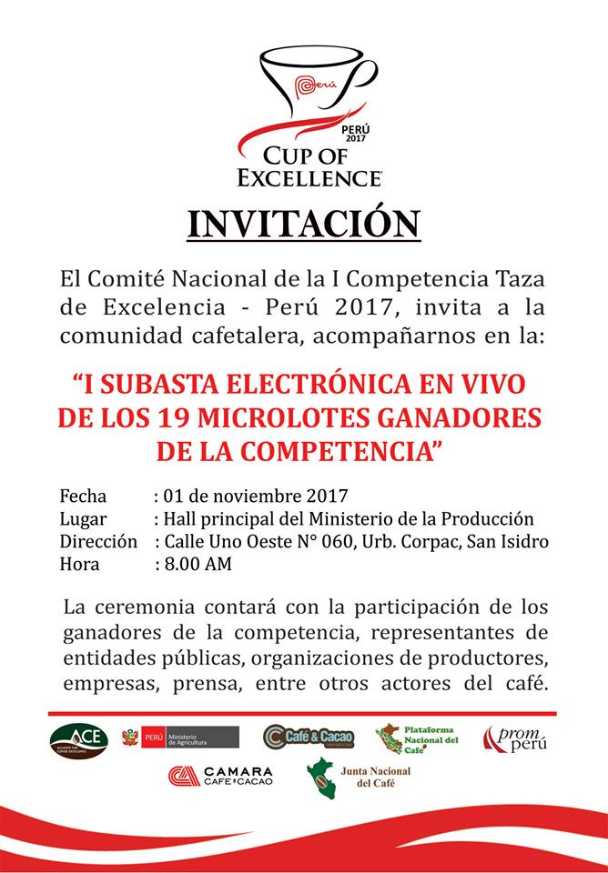 Como corolario de esta competencia, el miércoles 1 de noviembre se realizó la subasta electrónica internacional, que puso en evidencia el enorme potencial de nuestro parque cafetalero en el Perú. En esta subasta estuvieron presentes 19 productores cafetaleros. Juan Heredia, productor cafetalero de Jaén (Cajamarca) y primer puesto de la Taza de la Excelencia, logró recibir la cifra récord de USD 70,614.80 por 7 quintales de café. Se logró sobrepasar los US$10, 000 el quintal mientras que el precio más bajo cerró en US$ 900 el quintal, un éxito sin precedentes en la historia del café peruano. Felicitamos a los productores ganadores participantes en esta primera subasta electrónica y en general a todos los productores que participaron de esta competencia.