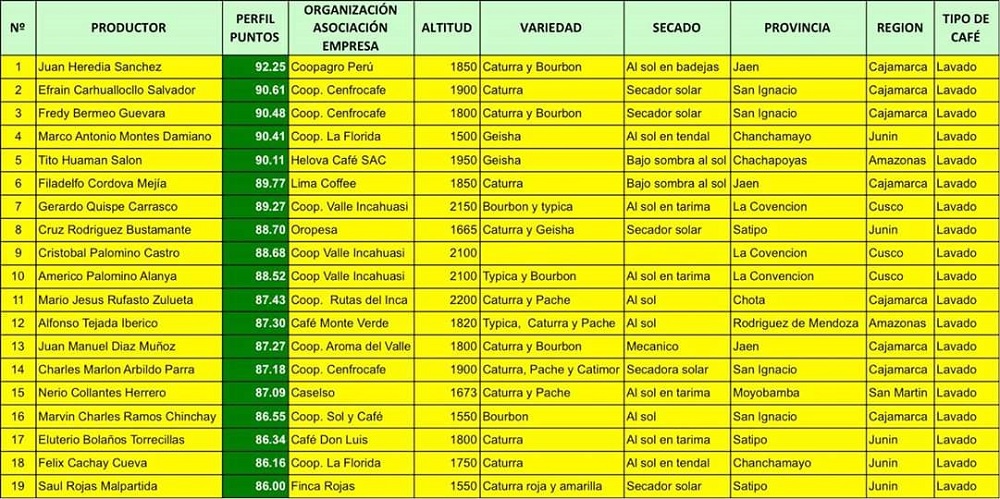 316 productores cafetaleros participaron en la primera edición nacional de la I Competencia Taza de Excelencia, de los cuales fueron pre seleccionados 92 cuyos cafés superaban los 86 puntos de perfil de calidad. De allí se trasladaron 78 micro lotes de los cuales con un exigente jurado de expertos catadores, pasaron 35 para la competencia internacional, habiendo calificado finalmente 19. Los cafés de los 5 primeros finalistas, pasan los 90 puntos de perfil de calidad.