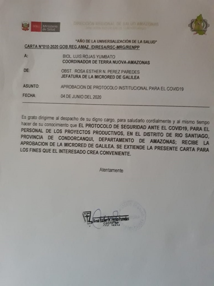 También, se viene implementando el Plan de prevención y de bio seguridad para los proyectos de desarrollo que se ejecutan en el distrito, plan que fue aprobado por la Micro Red de Salud de Galilea y que luego se socializó con la Municipalidad distrital de Río Santiago.