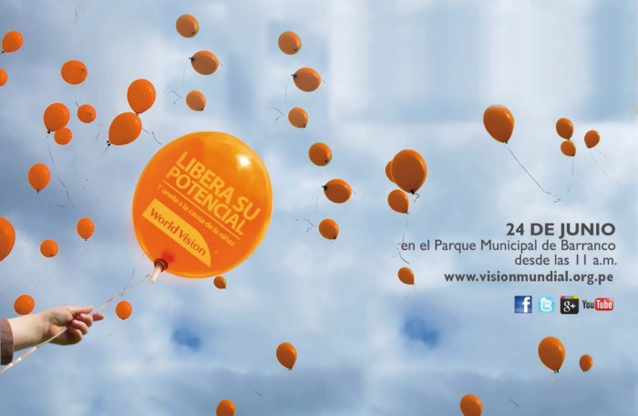 El domingo 24 de junio en el Parque Municipal de Barranco, a partir de las 11 am, los limeños tendremos la oportunidad de unirnos a la campaña por la niñez peruana, liberando miles de globos de helio, que estarán simbólicamente atados a la violencia, pobreza, discriminación, injusticia, abuso y otros que impiden que los niños desarrollen su potencial.